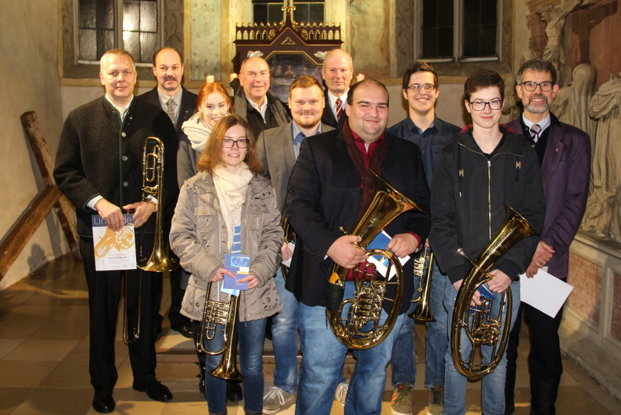 Anja Schöderlein und Jonas Mahr (Flügelhorn), Ina Amberger (Waldhorn), Pascal Amberger und Simon Schöderelein (Tenorhorn) sowie Maximilian Deppisch (Bariton).